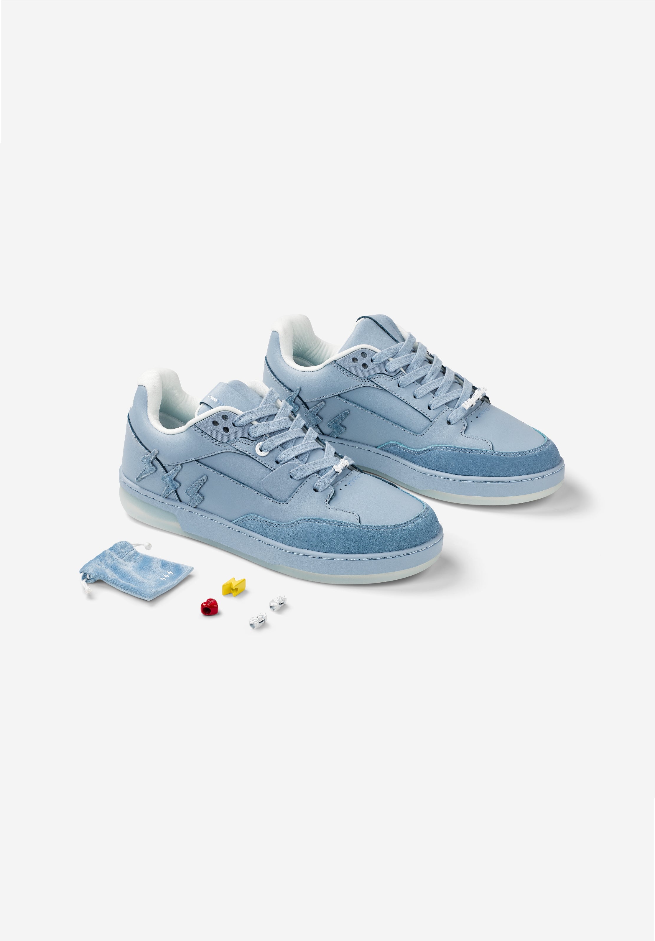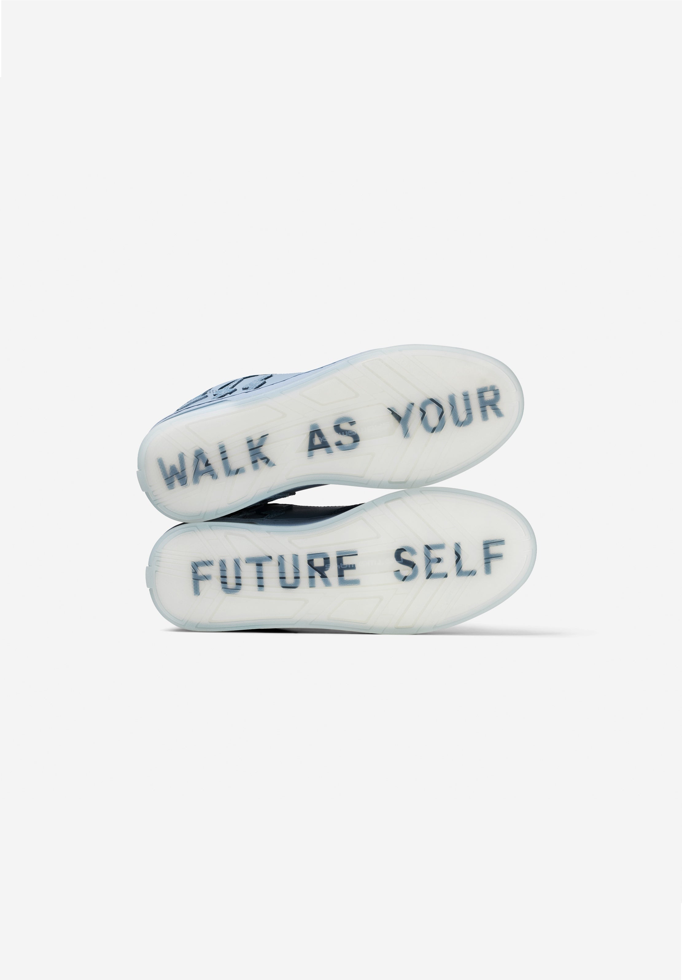 Crafted in soft suede blues and premium leather, and finished with a transparent outsole revealing the message beneath your feet: Walk As Your Future Self.